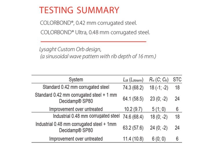 Metal roofing is a popular construction material in many parts of the world, particularly in Australia, Asia and other areas of Oceania, with metal roofing noise being a common issue. While metal offers a variety of benefits, it tends to exhibit excessive impact noise during rainfall due to its minimal internal damping. The net effect is an increase in interior noise levels, particularly in the case of high rainfall rates also reduced speech intelligibility, and disruption of sleep or concentration.